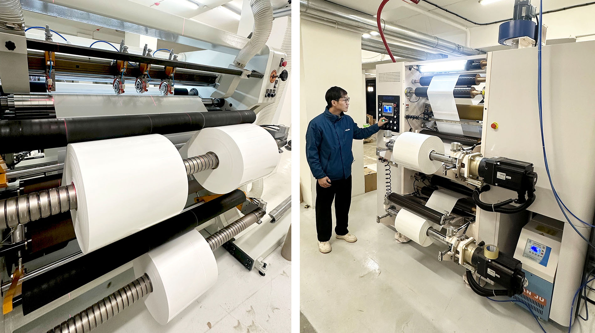 The new slitting and rewinding machine also plays a very important role in customer’s production flow, it can slit and rewind various materials including most films and papers, the width 1300mm is absolutely wide enough for jumbo raw material rolls, the rotary circular blade can slit materials into narrow size rolls precisely and stably, with this machine, the customer now has high flexibility on various width rolls request.